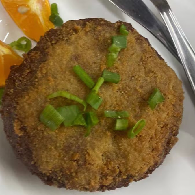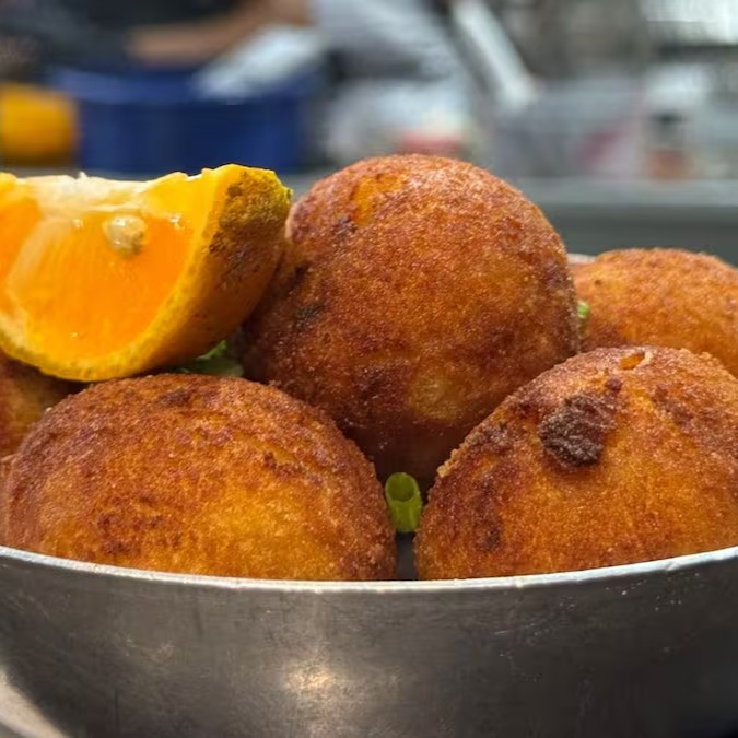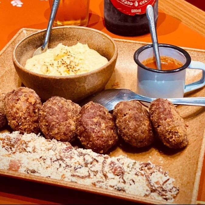 São 6 bolinhos de carne crocantes e suculentos, servidos com molho de tomate caseiro, farofa de cebola crispy com bacon e um purê cremoso de banana-da-terra com parmesão. Uma explosão de sabor mineiro! Prato premiado no Botecar 2023!