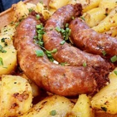 Linguiça pura, caipira, artesanal acompanhada de mandioca macia e cozida com manteiga de garrafa