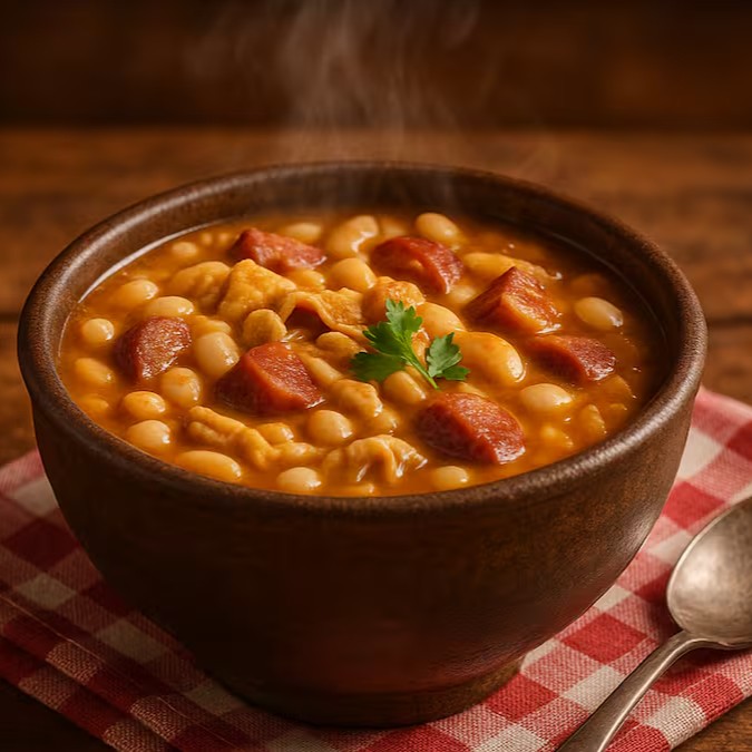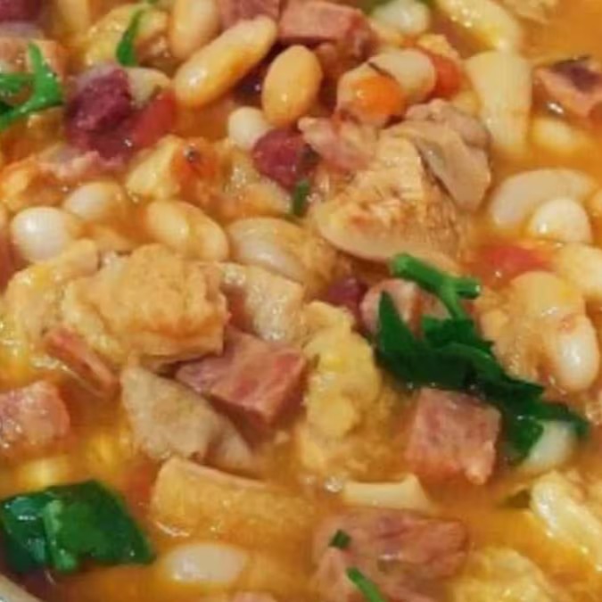 Dobradinha deliciosa cozida com Feijão Branco, Calabresa e Bacon.