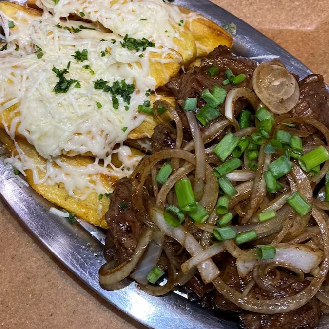 Contra filé macio, grelhado no ponto certo e coberto com cebolas douradas, acompanhado de batata frita feita aqui na casa e coberta por queijo ralado. Um clássico irresistível, cheio de sabor e sustância, perfeito para matar a fome com prazer.