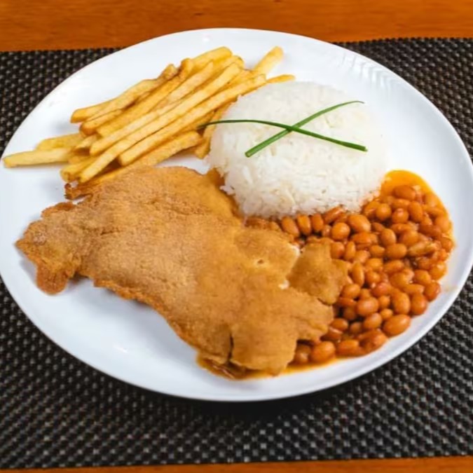 Filé de frango à milanesa macio e crocante, com arroz, feijão e batata fritas.