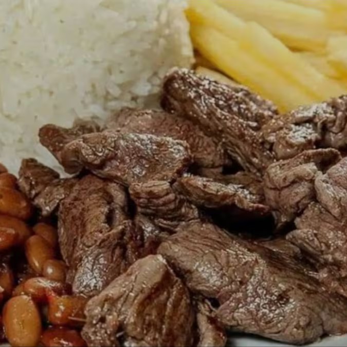 Iscas suculentas de alcatra, temperadas e grelhada na medida certa para preservar todo o sabor. Acompanha arroz branco soltinho, feijão encorpado e batata frita crocante, garantindo uma refeição completa e deliciosa.