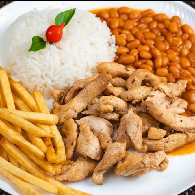 Iscas de frango grelhado, acompanhado de arroz branco soltinho, feijão de caldo encorpado e batata frita crocante.