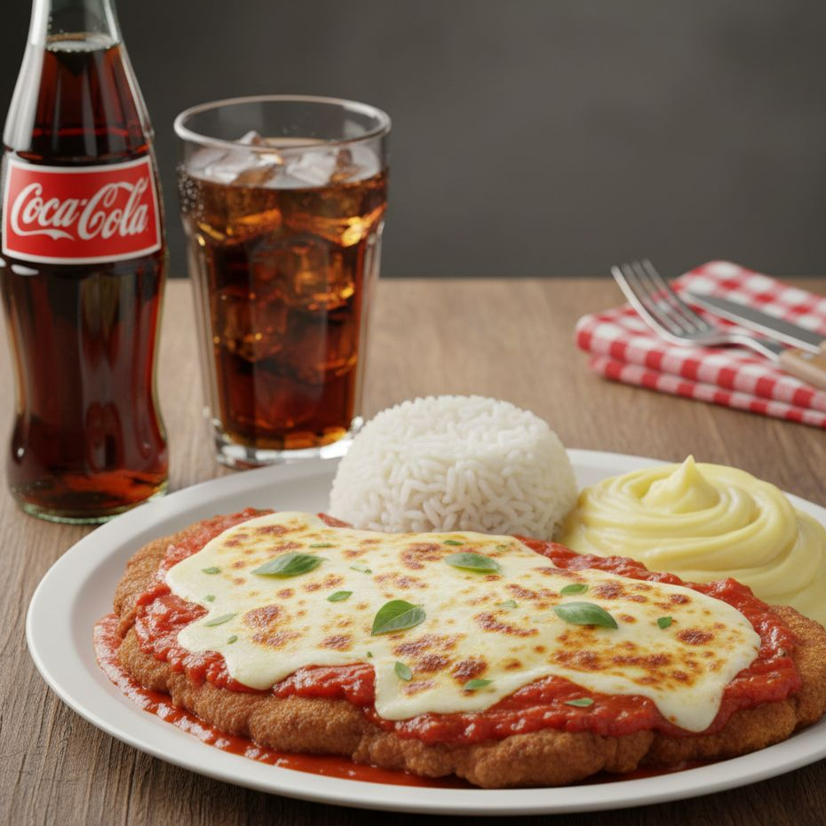 Peito de frango empanado e crocante, coberto com molho de tomate caseiro e queijo derretido. Acompanha arroz branco soltinho e purê de batata cremoso.