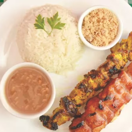 Seu Espeto Preferido + 05 Acompanhamentos Arroz; Feijão; Fritas; Salada; Farofa especial da casa.