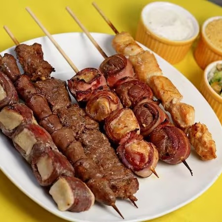 Desfrute de um irresistível espetinho na brasa. Mais de 15 sabores a sua escolha.
