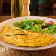 Arroz, feijão, fritas, salada, farofa e omelete de queijo tamanho grande..
