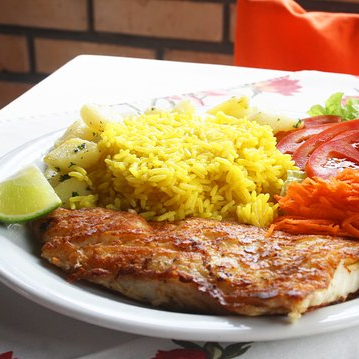 Arroz, feijão, salada, fritas, farofa e tilápia.