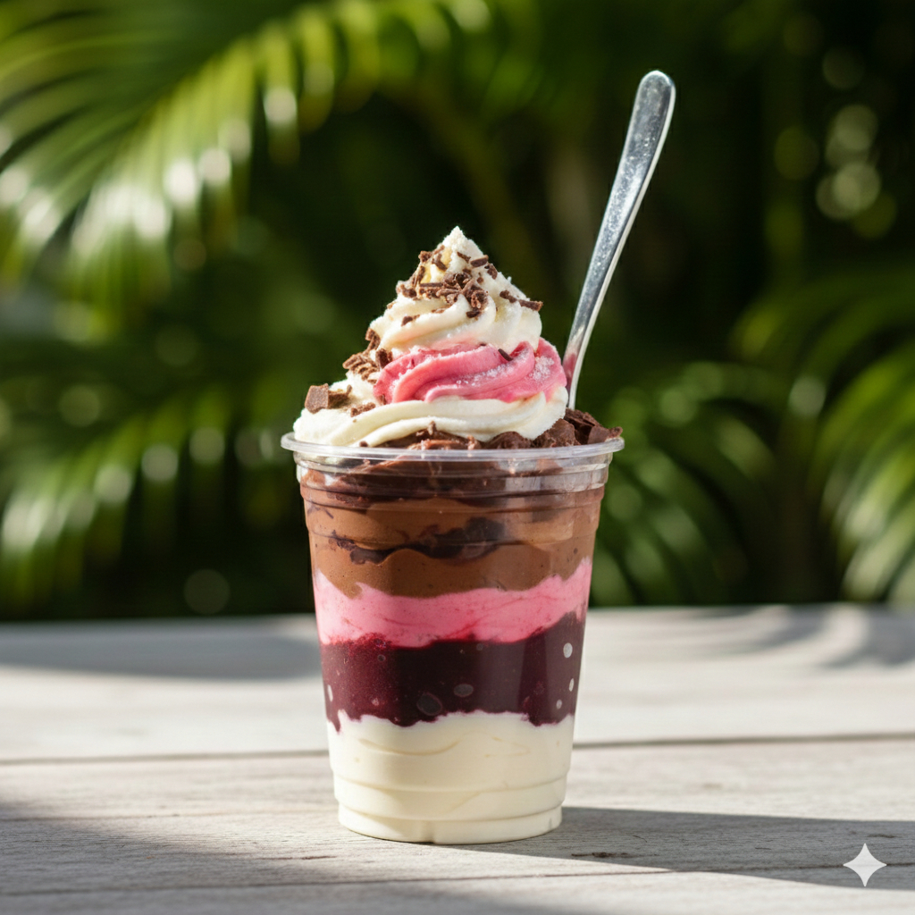Creme de Açaí, creme de chocolate artesanal, leite em pó e leite condensado. Os copos ja vão montados