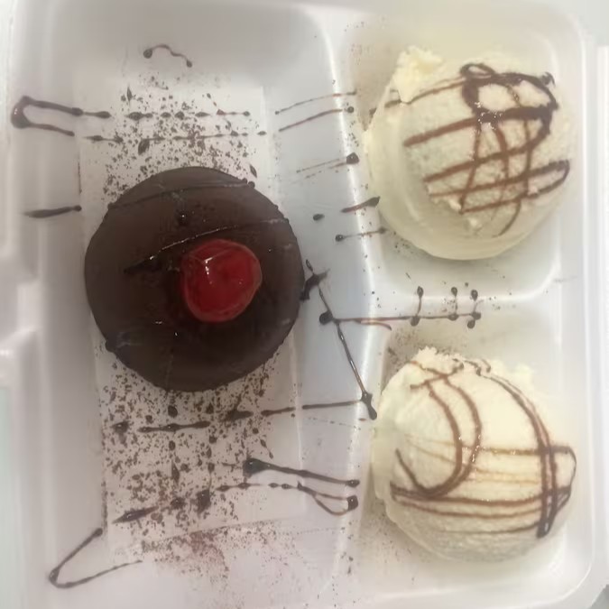 Bolo 100g chocolate com duas bolas sorvete sabor baunilha.