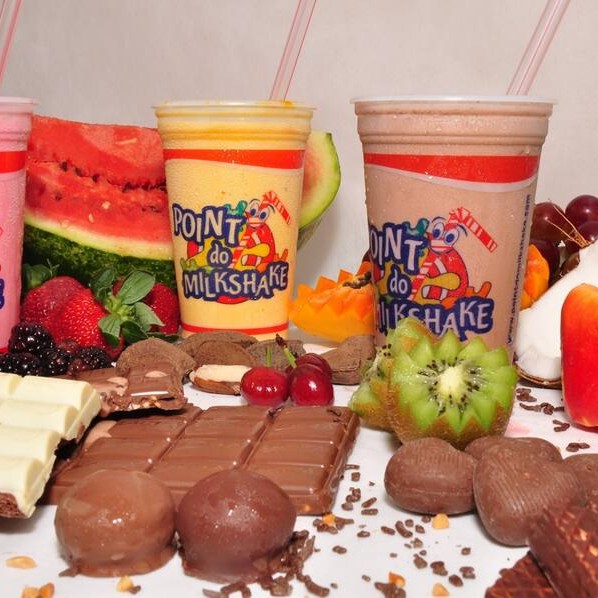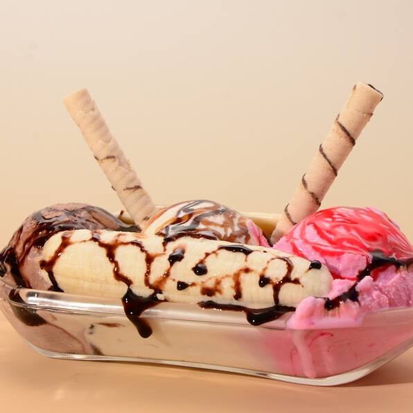 Banana, três bolas de sorvete sendo uma de baunilha, uma chocolate e uma morango, coberturas caramelo, morango e chocolate e dois tubetes.