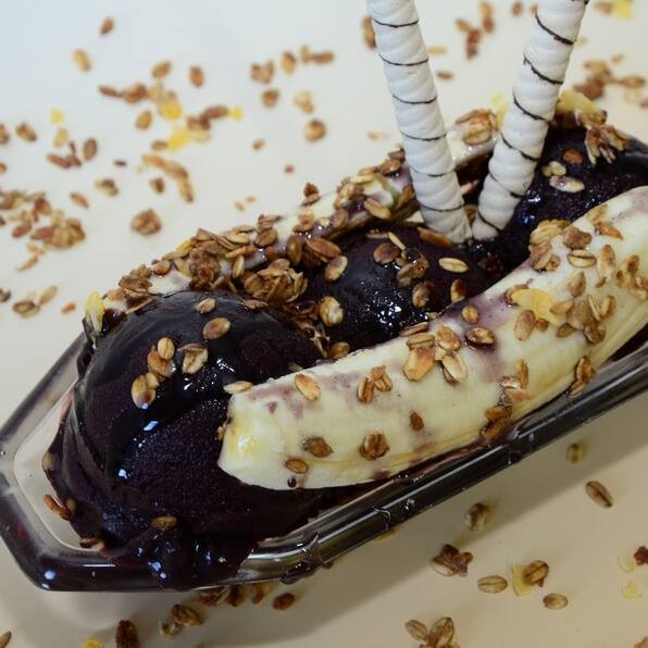 Banana, três bolas de açaí, cobertura sabor açaí, dois tubetes e granola.