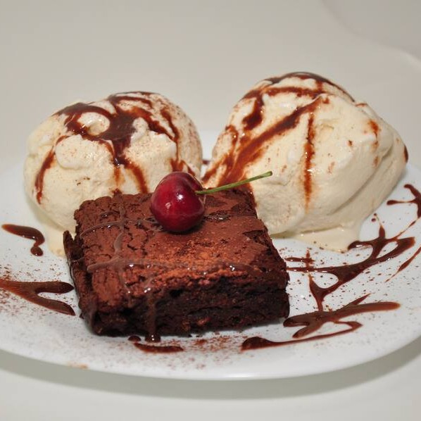 Bolo 100g chocolate c/ castanha e duas bolas sorvete sabor baunilha.