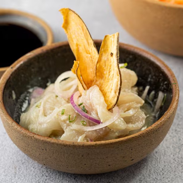 100g de cubos de peixe branco, marinados com cebola roxa, pimenta dedo-de-moça, cebolinha e coentro.