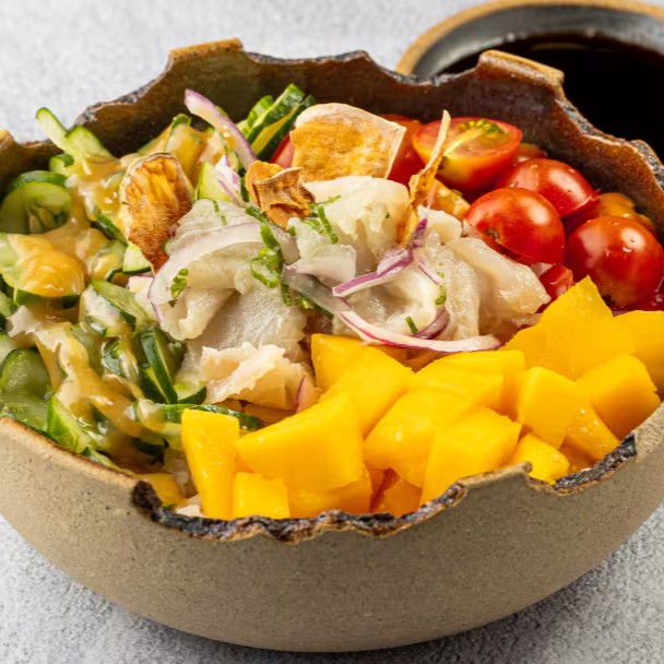 Ingredientes: Cebola roxa crua, cebolinha, manga, tomate grape, pepino japonês com pasta de missô