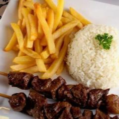 Arroz, Feijão, Espetinho, Batata Frita, farofa e Salada