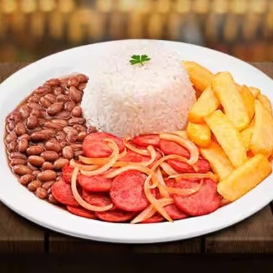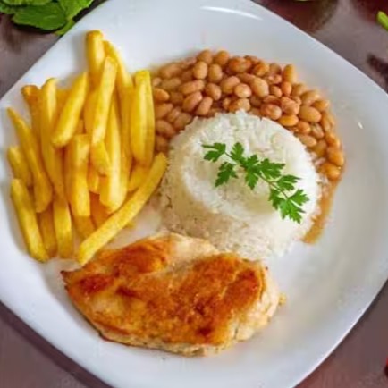 Acompanhado de um Arroz branco soltinho, feijão carioca bem temperado e batatas fritas crocantes.