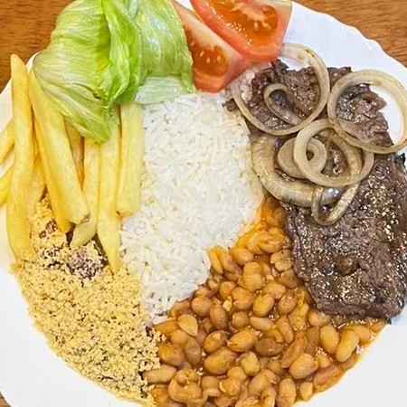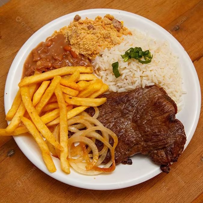 Acompanhado de um Arroz branco soltinho, feijão carioca bem temperado, batatas fritas crocantes e uma deliciosa farofa de bacon.
