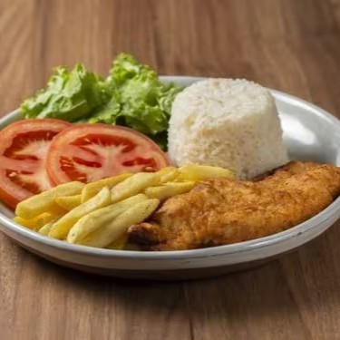 Acompanhado de um Arroz branco soltinho, batatas fritas crocantes e salada de tomate e alface fresquinha.