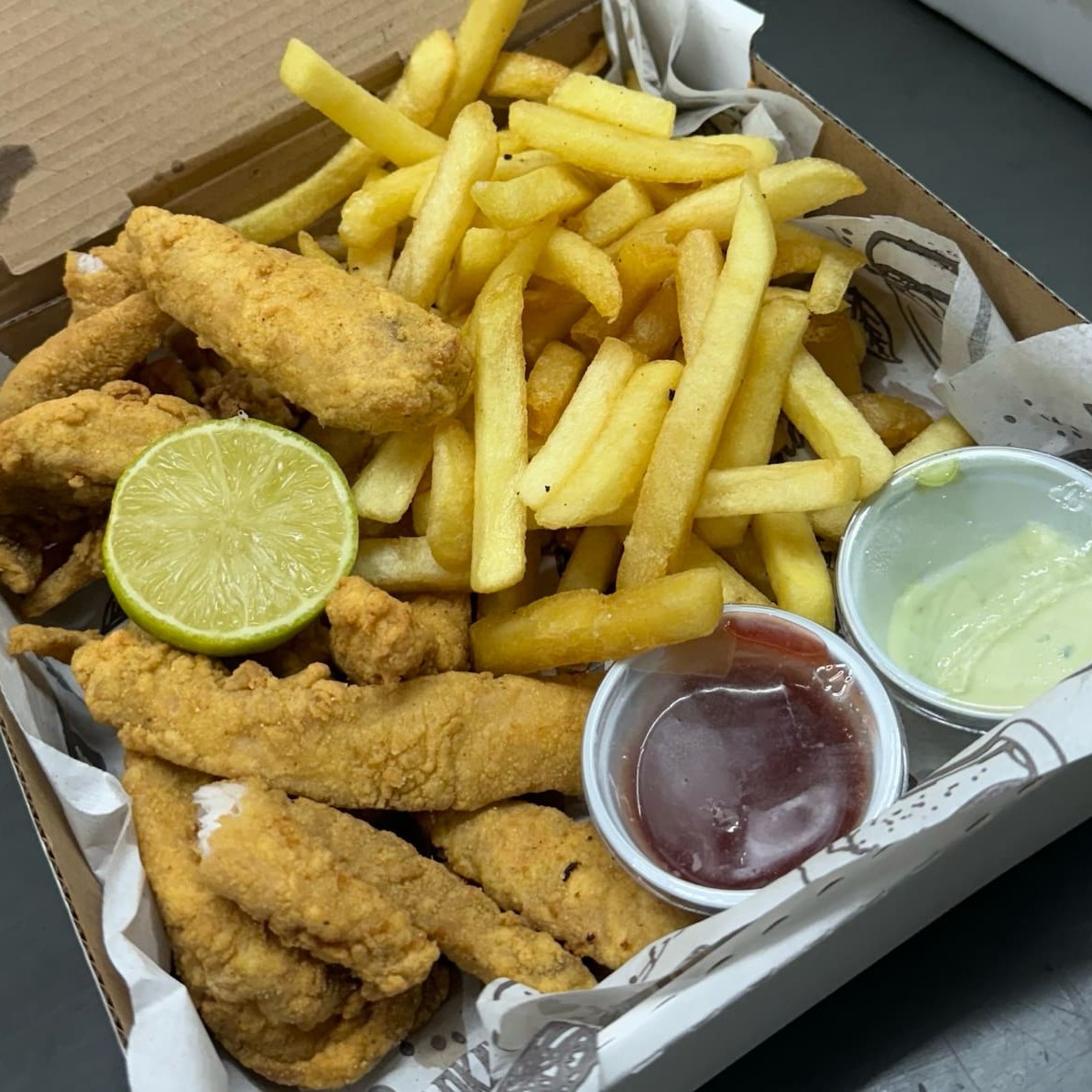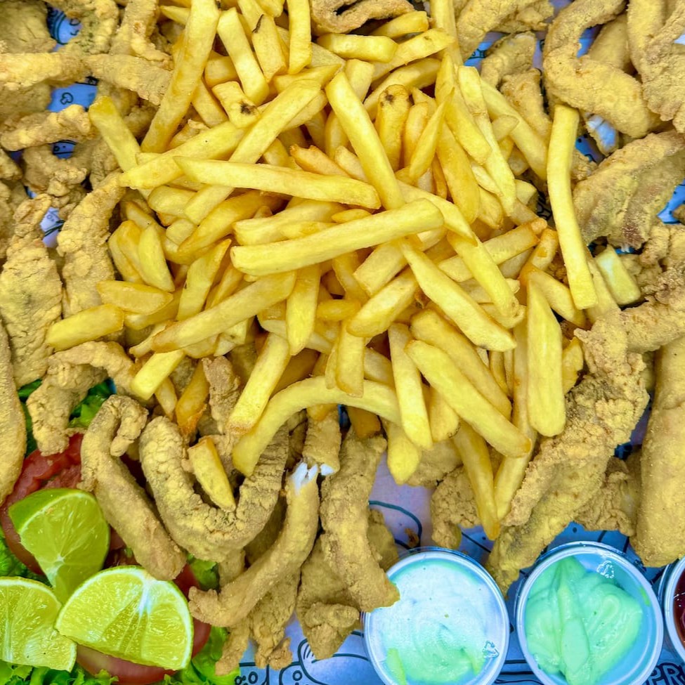 Iscas de peixe crocantes, sequinhas e bem temperadas, servidas com batata frita dourada. Uma porção generosa de 1kg de iscas e 500g de batata perfeita !!