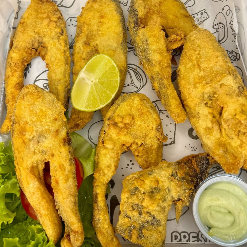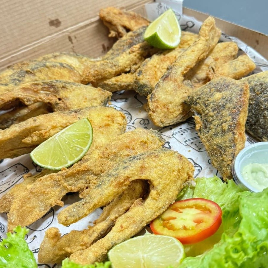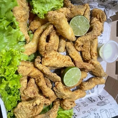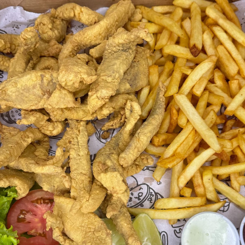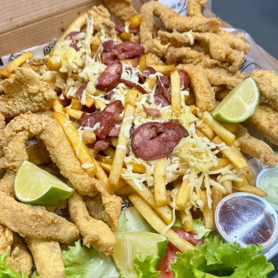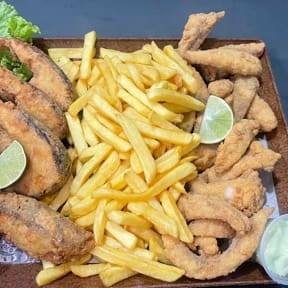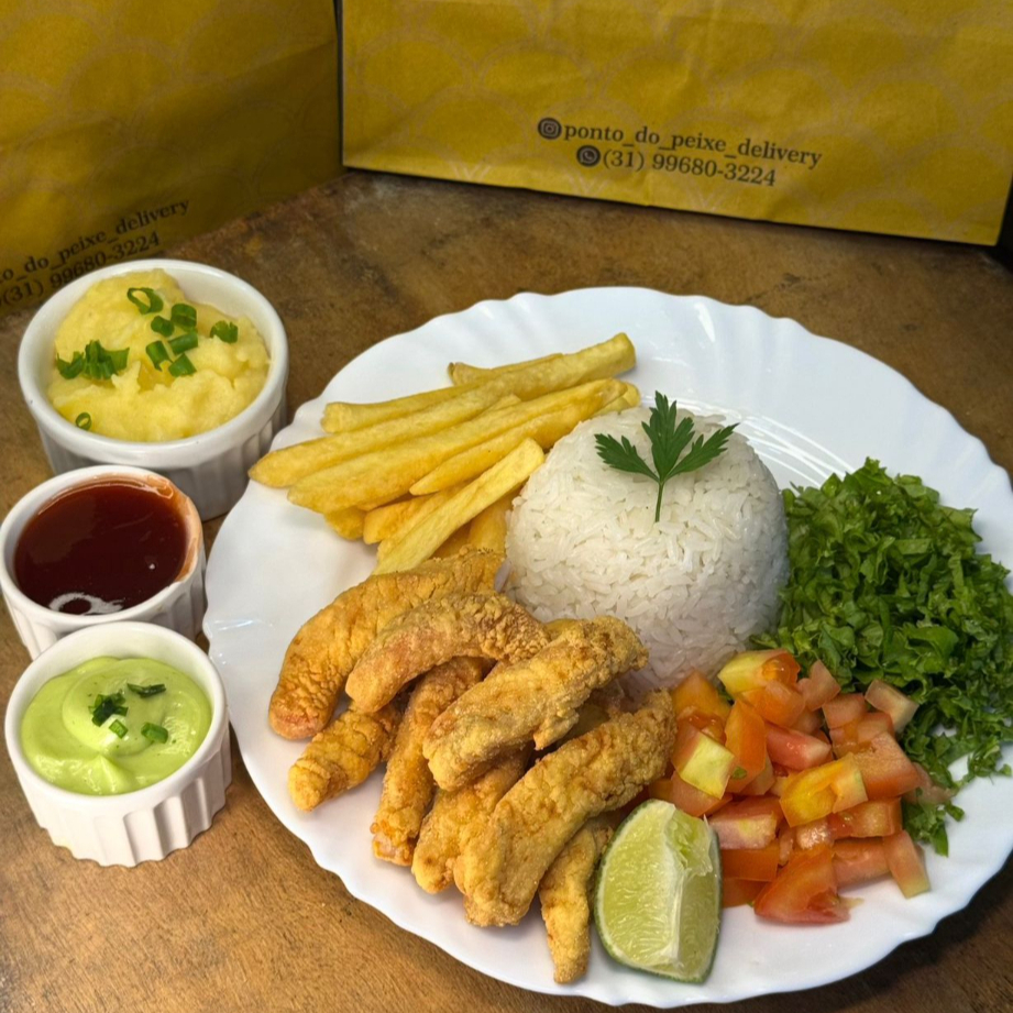 1kg de iscas de tilápia fresquinha, empanadas e fritas até ficarem douradas e crocantes, acompanhada de 500g de batata com recheio turbinado por conta da Casa.