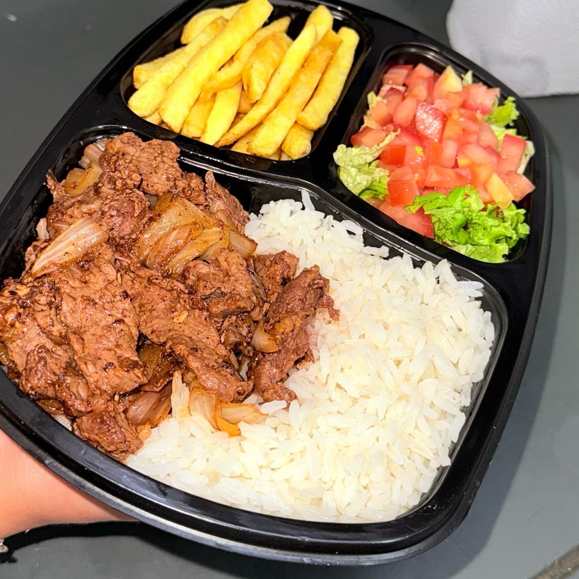 Arroz, contra filé, batata e salada
