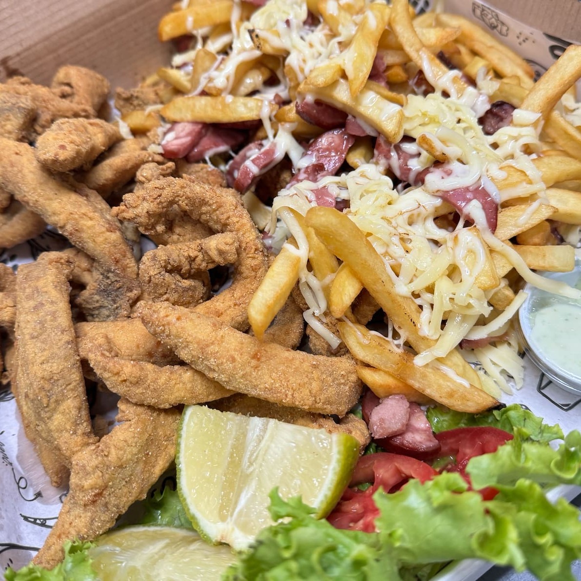 Iscas de 500 g crocante , batata frita sequinha , turbinada com recheio da casa com bacon , calabresa e queijo derretido