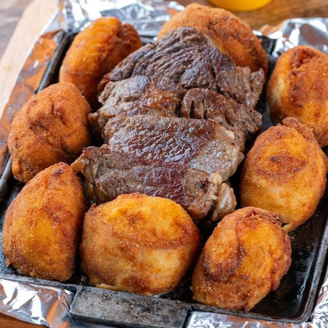 500gr de bife ancho (file de costela) mais batata recheada acompanha farofa e vingrete