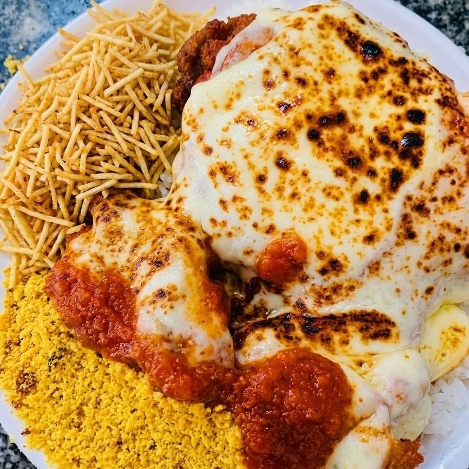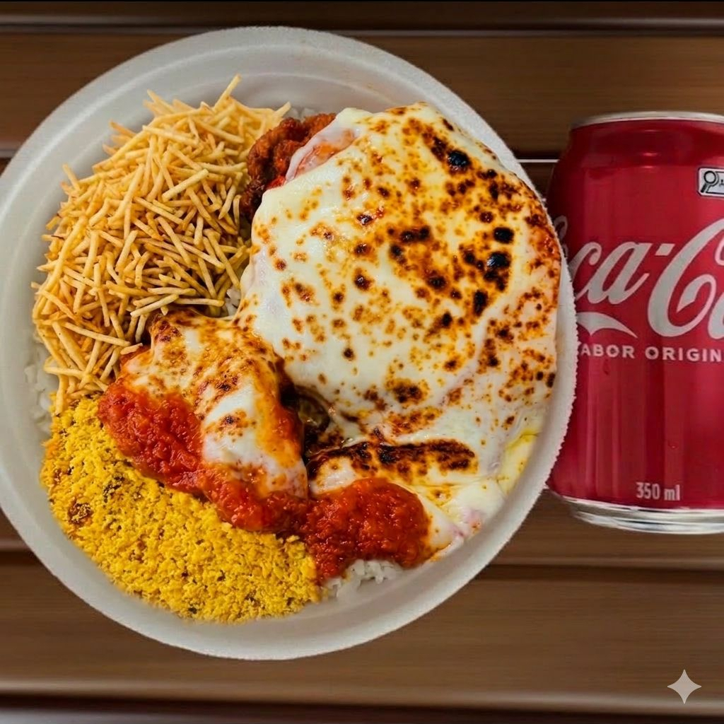 Combo Parmegiana Individual (Coca 350ml) Marmitex (aprox. 450g a 500g): Arroz soltinho, bife de frango empanado, molho de tomate suculento, queijo derretido, farofa da casa e batata palha crocante. Acompanha: 1 Coca-Cola lata 350ml geladinha.