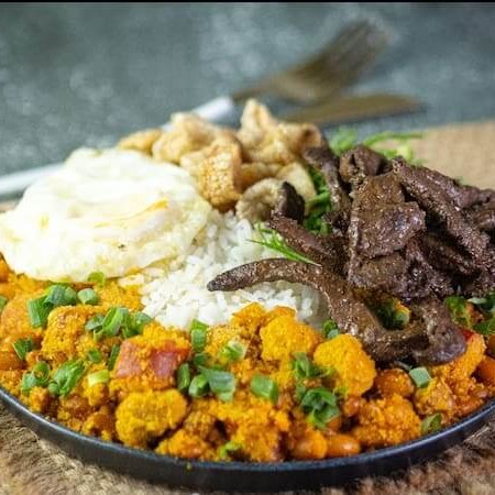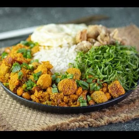 Acompanhamento - tropeiro, arroz, torresmo, couve, ovo frito, isca de fígado