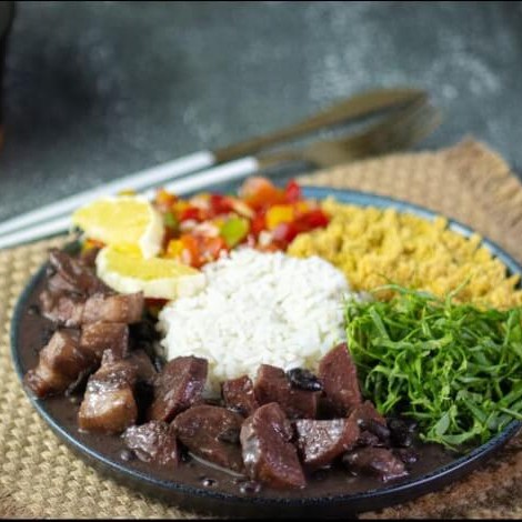 Acompanhamento: Arroz, feijoada, pernil, bacon, liguiça, farofinha, couve, laranja, vinagrete