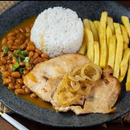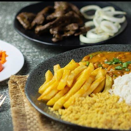 Acompanhamento: Arroz, feijão, Macarrão alho e oléo, batata frita, salada do dia
