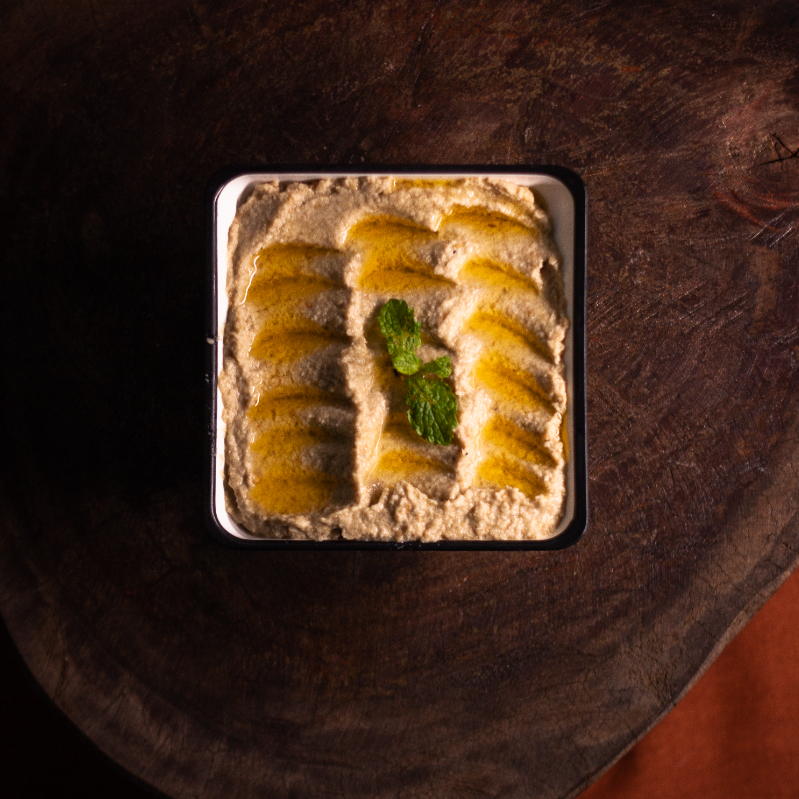 Grão de bico cozido, tahine (pasta de gergelim), alho e suco de limão.