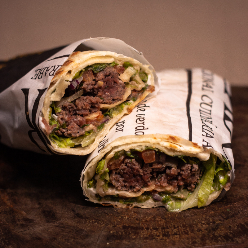 Enrolado no pão sírio com kafta, pasta de grão de bico ou alho, salsinha, cebola, picles, alface e tomate.