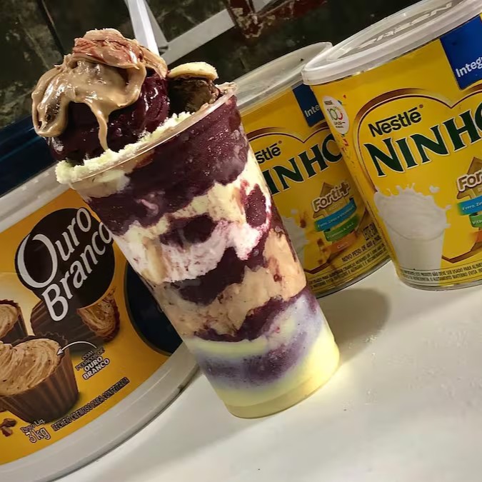 Um delicioso mix de açaí!! Preparado especialmente para você amante de Ouro Branco!! Nele você encontrara leite condesado, um Delicioso creme de Ouro Branco, chantilly e leite em pó!
