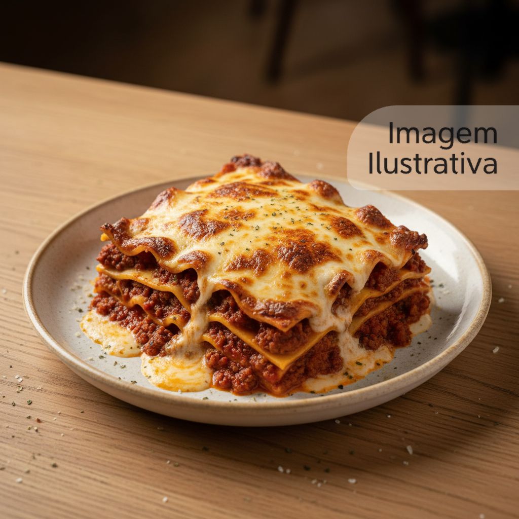 Lasanha tradicional com camadas de massa fresca, molho bolonhesa e queijo gratinado.