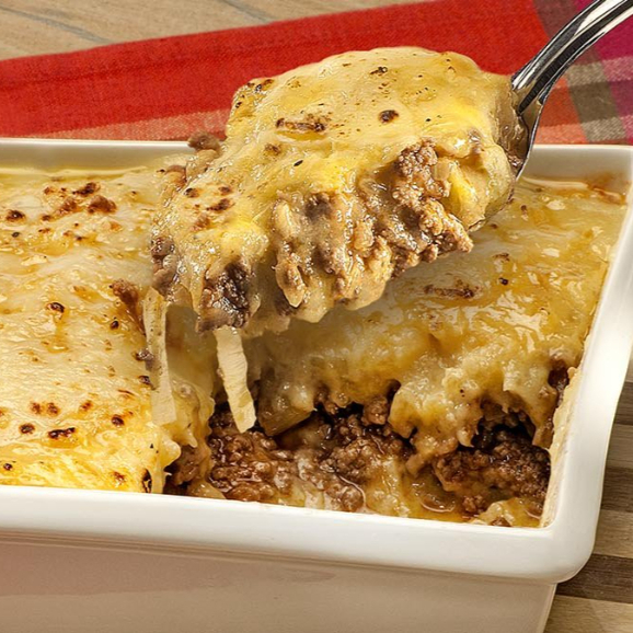 Camadas de purê de batata cremoso com carne moída suculenta, coberto com queijo derretido.