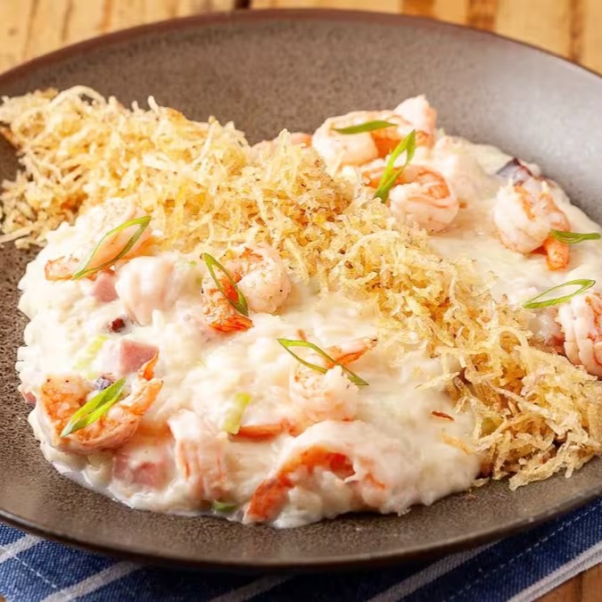 Nova Receita! Uma generosa porção de camarões grelhados na manteiga com bacon, parmesão fresco ralado, molho branco, queijo muçarela, alho poró, batata palha e arroz. Observação. Este prato não utiliza arroz arbóreo.