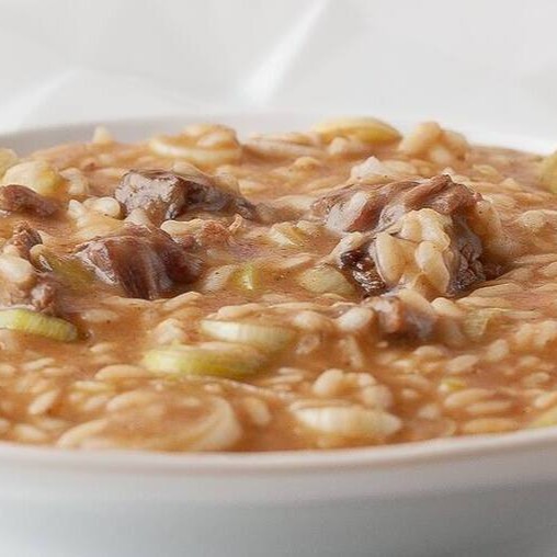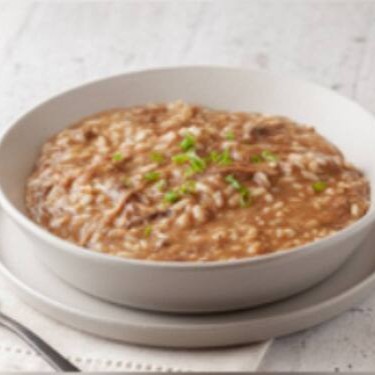 Um delicioso risoto servido com costelinha bovina desfiada, cozido no caldo da própria costela, finalizado com cebolinha e salsa crespa, finalizado com cebolinha e salsa crespa.