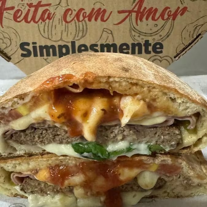 1º andar: pão especial, batata palha, milho, alface americana hidropônica, tomate andréa. 2º andar: dois (2) hambúrgueres de boi (120g), queijo derretido, presunto, Catupiry.