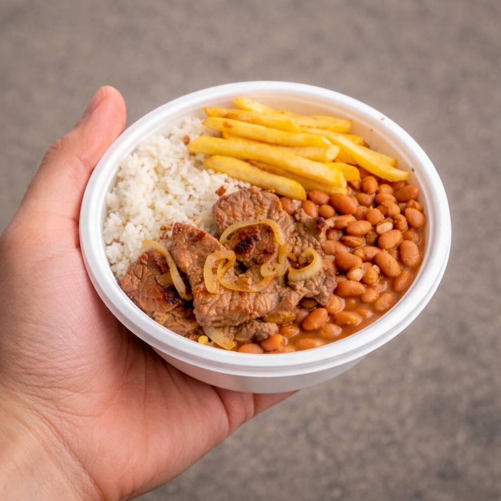 Marmita econômica com arroz, feijão, batata frita e carne + porção extra de batata crocante. Ideal pra quem quer comer mais gastando pouco.
