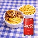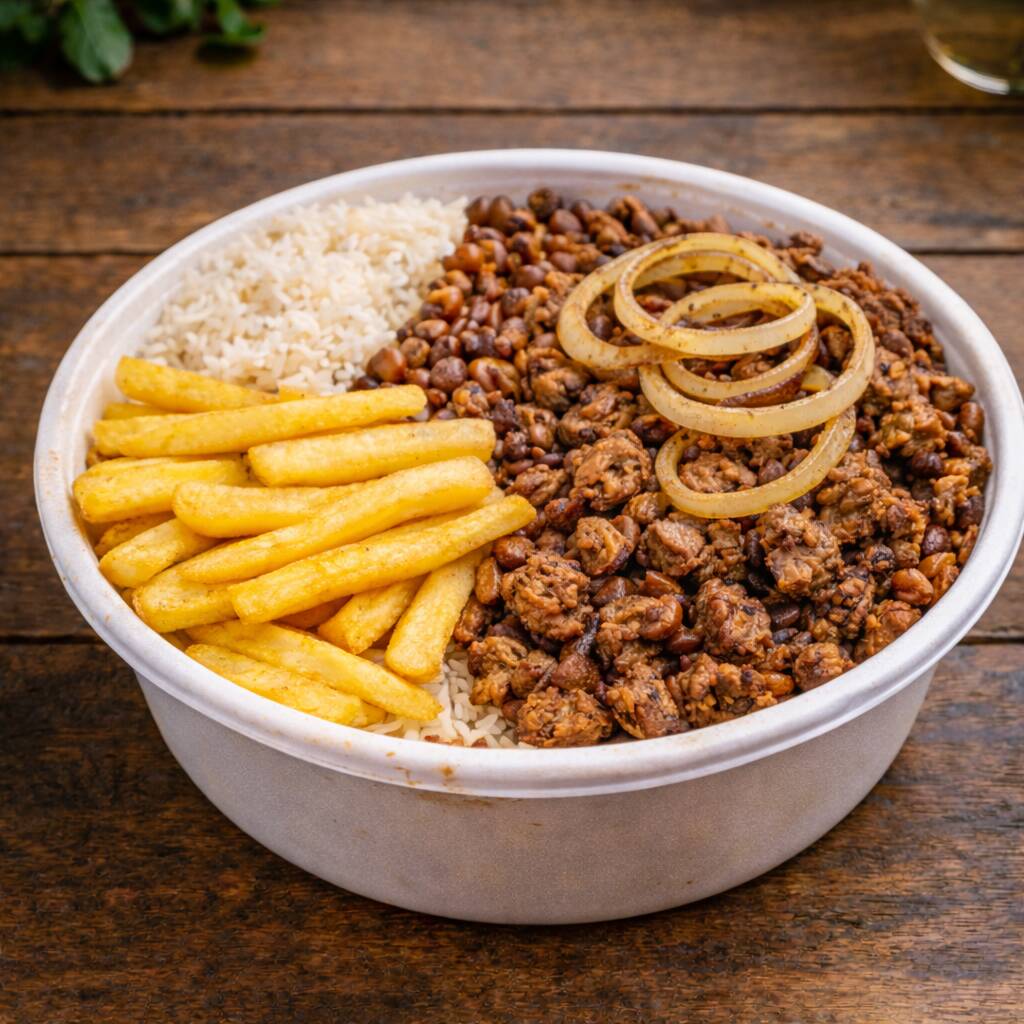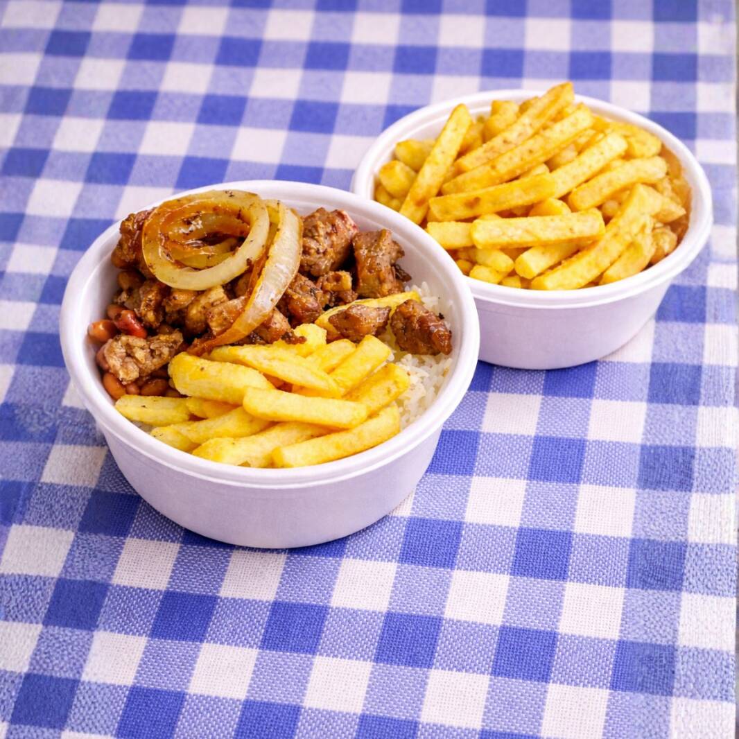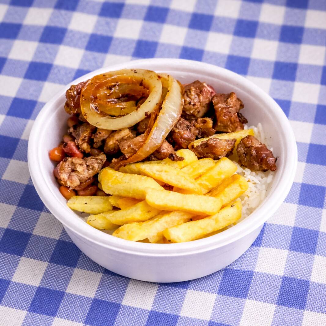 Está incluso: Arroz, feijão, batata frita + carne de porco picadinha acompanhada de cebola
