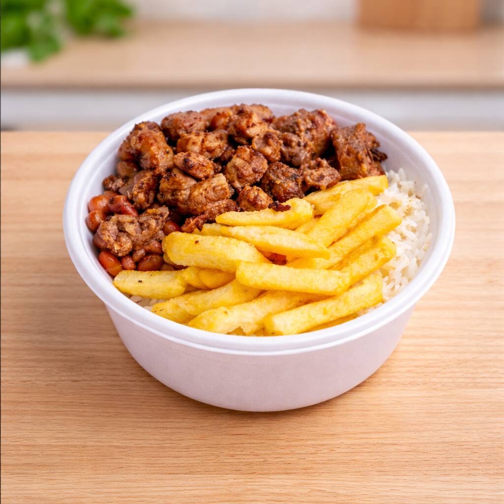 Arroz, Feijão, Pernil Picadinho + Batata Palito