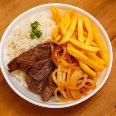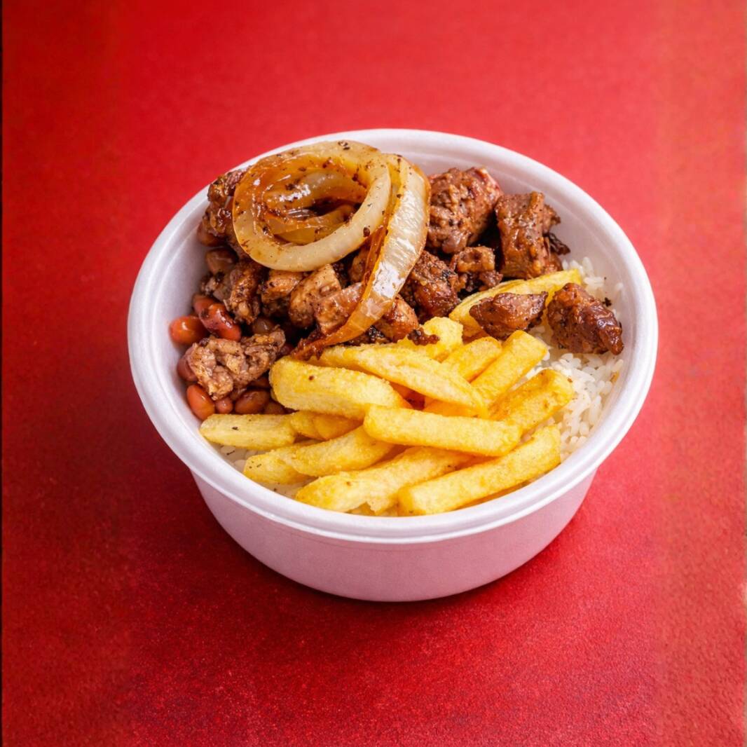 Prato caprichado com arroz quentinho, feijão temperado, porção generosa de batata frita e carne suculenta acebolada. Ideal para quem quer um almoço reforçado.