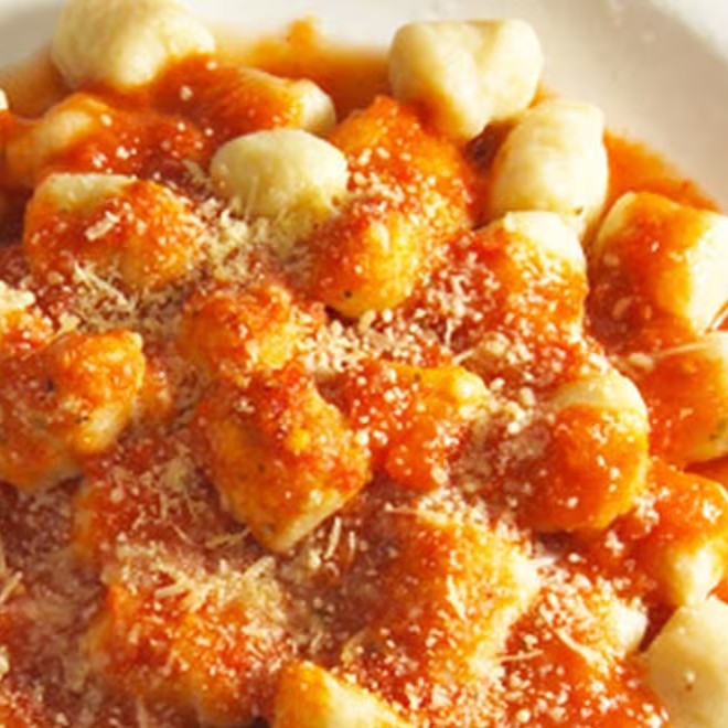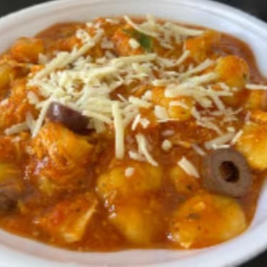 Nhoque, molho ao sugo com pedaços de tomate, azeitonas pretas, parmesão ralado fresco e manjericão.
