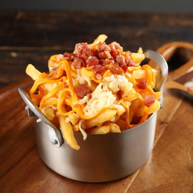 Aproximadamente 350 gramas de fritas, mussarela, bacon e cheddar.