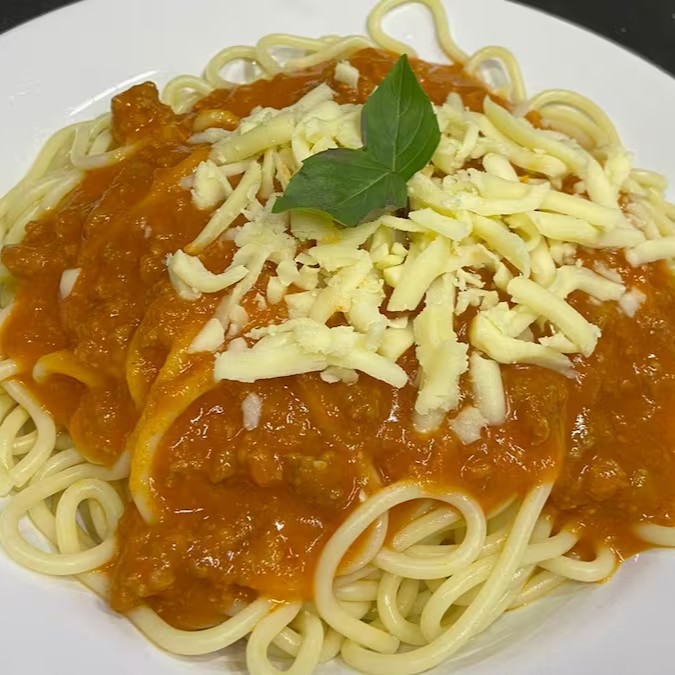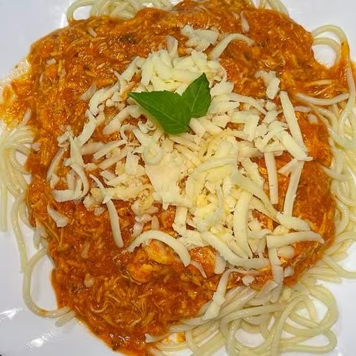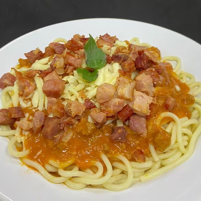 Massa de espaguete, molho á bolonhesa, frango desfiado, bacon, milho, Catupiry, mussarela gratinada e orégano