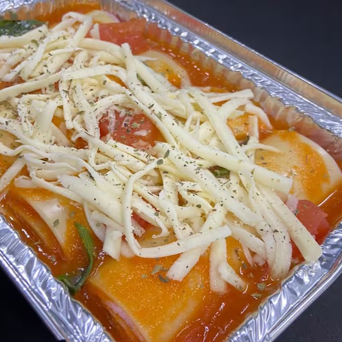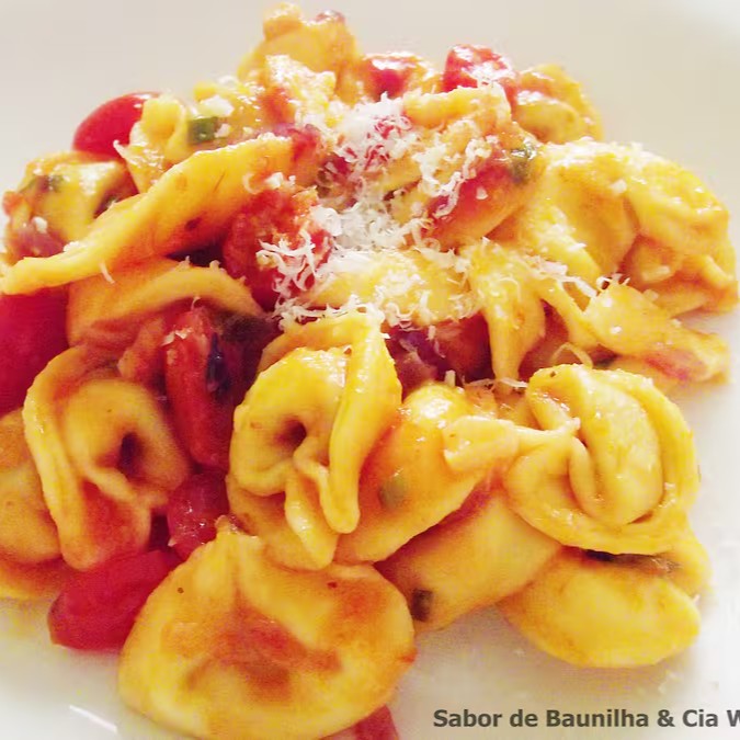 Massa de capeletti recheada com quatro queijos, molho ao sugo com pedaços de tomate e parmesão fresco ralado
