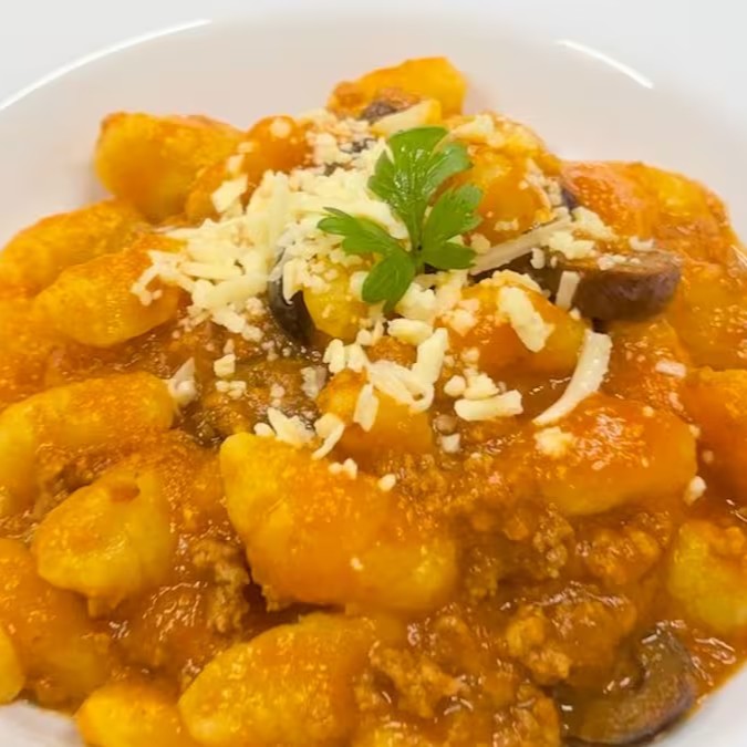 Nhoque, molho á bolonhesa, azeitonas pretas, parmesão ralado fresco e manjericão