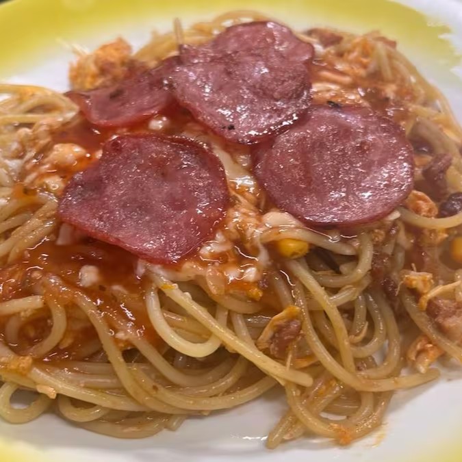 Massa espaguete, molho shoyo, frango desfiado, bacon, calabresa, milho, mussarela e molho de tomate.